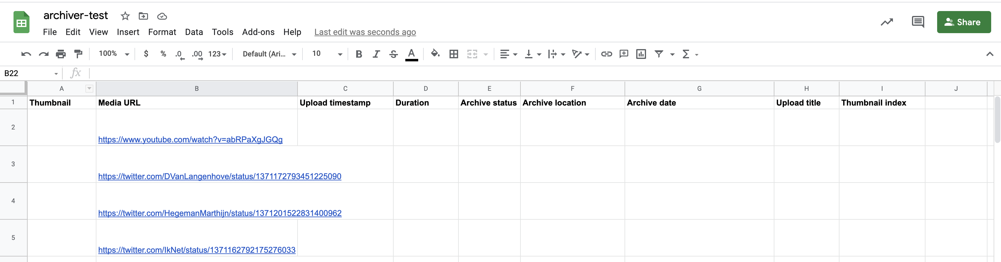 Link (required): the location of the media to be archived. This is the only column that should be supplied with data initiallyArchive status (required): the status of the auto archiver script. Any row with text in this column will be skipped automatically.Destination folder: (optional) by default files are saved to a folder called name-of-sheets-document/name-of-sheets-tab/ using this option you can organize documents into folder from the sheet.Archive location: the location of the archived version. For files that were not able to be auto archived, this can be manually updated.Archive date: the date that the auto archiver script ran for this fileUpload timestamp: the timestamp extracted from the video. (For YouTube, this unfortunately does not currently include the time)Upload title: the "title" of the video from the original sourceHash: a hash of the first video or image foundScreenshot: a screenshot taken with from a browser view of opening the pageDuration: duration in secondsThumbnail: an image thumbnail of the video (resize row height to make this more visible)Thumbnail index: a link to a page that shows many thumbnails for the video, useful for quickly seeing video contentFor example, for use with this spreadsheet: